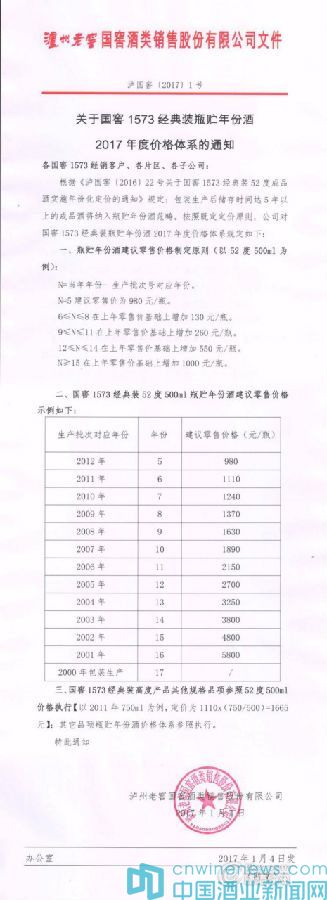 上述内容,均出现于2017年1月4日晚间泸州老窖国窖酒类销售有限公司下发的《关于国窖1573经典装瓶贮年份酒2017年度价格体系的通知》(以下简称“通知”)当中。