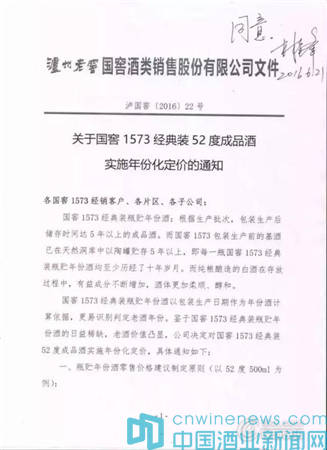 附:2016年《关于国窖1573经典装52度成品酒实施年分化定价的通知》