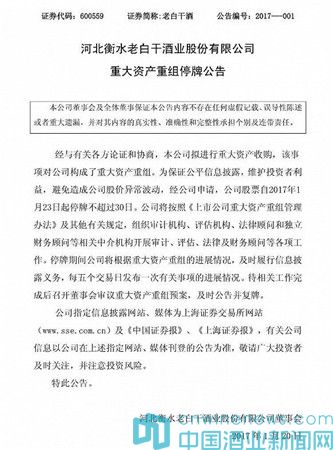 20日晚间,衡水老白干突然发布老白干酒重大资产重组停牌公告,公告表示:经与有关各方论证和协商,本公司拟进行重大资产收购。该事项对公司构成了重大资产重组。
