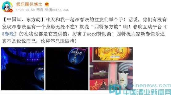 可以说,@春晚、VR春晚是互联网兴盛、科技发展的时代产物,他们的成功推行一方面体现了中国春晚不断创新的精神态度,另一方面也正昭示了其品牌赞助商四特酒的企业理念——“让传统的更传统,让现代的更现代”。