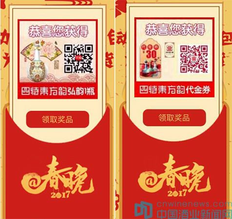 在2017年《@春晚》有奖互动环节,四特酒送出千瓶美酒和万份优惠券,广大观众一边看喜欢的明星拜年送祝福,一边不停地抽红包,其乐无穷,热闹非常,粉丝、网友们大呼过瘾。