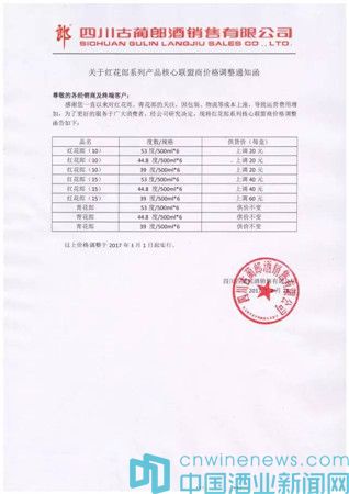 就在前几天,郎酒公司下发过一则通知:2月25日起,红花郎系列产品正式执行2017年新调整后的出厂价格,其中红花郎(10)厂价上调20元;红花郎(15)上调40元;青花郎取消所有配赠政策。