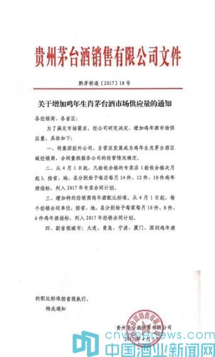 4月5日,贵州茅台酒销售有限公司(以下简称“公司”)发布《关于增加鸡年生肖茅台酒市场供应量的通知》。通知称,为了满足市场所需,经公司研究决定,增加鸡年酒市场供应量,具体如下: