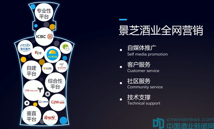 百亿征程离不开营销模式创新,景芝酒业2017年互联网战略发布。自2011年成立电子商务部,景芝酒业以互联网思维推动组织、技术、模式创新,开启了白酒+互联网的产业新模式。凭借金融服务、平台增值服务、技术服务输出和PB战略四个版块,极优佳营销新平台规划在2019年实现整体盈利,并最终实现以品牌商、经销商、终端店、消费者为核心的极优生态圈和以总部基地、云数据基地、创新孵化基地、智能物流基地为中心的极优产业蓝图。