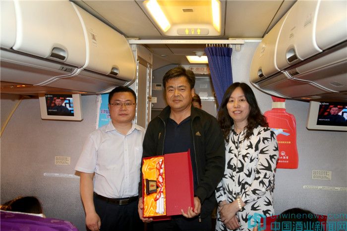 泰山酒业副总经理刘艳林(右)为山航旅客颁发奖品