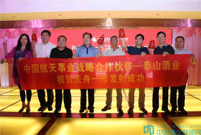 中国航天基金会领导、泰山酒业副总经理刘艳林(左一)等共同庆祝天舟一号发射成功