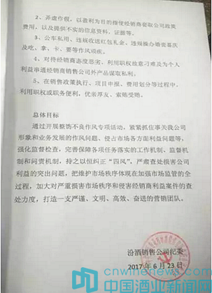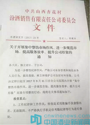 今天,汾酒销售公司出台了一份力度空前的文件,《关于开展集中整饬市场作风、进一步规范市场、提高服务效率、提升公司形象的通知》,该文件表示,从6月23日起至9月31日,汾酒将在全公司范围内开展市场专项整治行动。将集中5个方面检查问题。