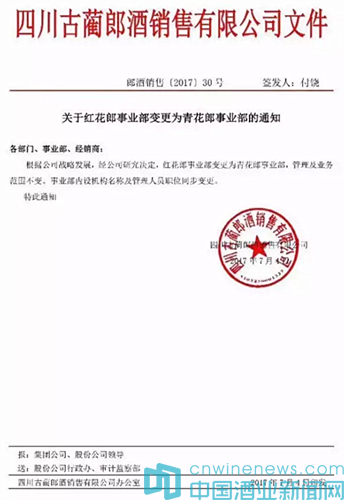 7月4日,微酒记者获悉,7月4日,四川古蔺郎酒销售有限公司面向各部门、事业部及经销商发布《关于红花郎事业部变更为青花郎事业部的通知》。