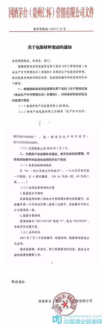 7月7日,国酒茅台(贵州仁怀)营销有限公司发布关于包装材料变动的通知。通知称,根据国家食品药品监管总局发的《关于贯彻实施(食品生产许可管理办法)的通知》及规范生产包装班组管理,现对包装材料标识标注内容,包装班组编号和包装喷码作如下修改: