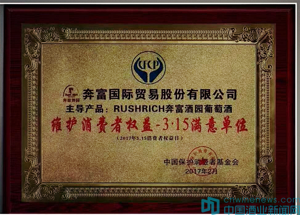图为中国保护消费者基金会授予奔富股份“维护消费者权益——3.15满意单位”称号
