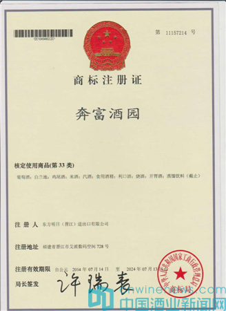 据悉,注册号为第11157214号的33类“奔富酒园”系东方明日(晋江)进出口有限公司成功注册的合法商标,该商标于2015年12月14日已获准注册并公告,核准使用的商品范围包括葡萄酒、白兰地等,法律保护唯一商标专用权的有效期限为2014年07月14日至2024年07月13日。