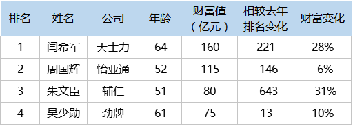 2016年,中国酒水行业比今年多两人上榜,分别是百润集团董事长刘晓东(741名,169亿元),郎酒集团董事长汪俊林(1964名,65亿元)。