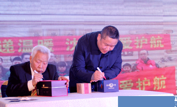 国际酿酒大师赖高淮(左)、中国沈酒集团总裁沈鸿林(右)亲自为慈善拍卖酒签名