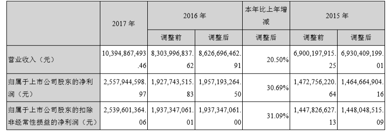 4月10晚间,泸州老窖发布2017年度报告。报告期内,公司实现营业收入103.95亿元, 同比增长20.50%;归属于上市公司股东的净利润25.58亿元,同比增长30.69%。
