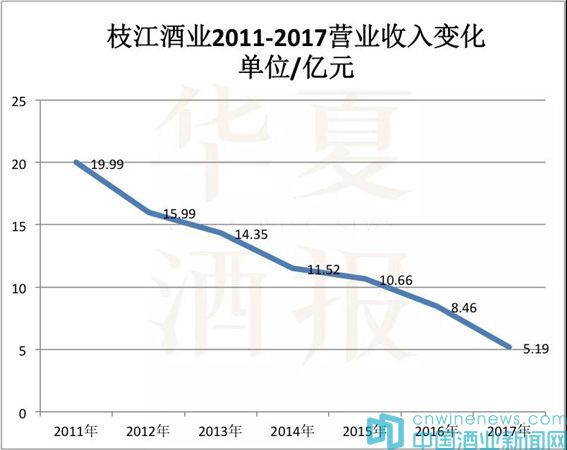然而“远嫁”之路很快显现出不适感。先来看枝江酒业2011-2017年的营业收入,从2012年开始,营收开始出现明显下滑,到2017年,营业收入仅为5.19亿元。