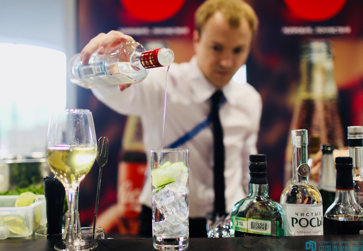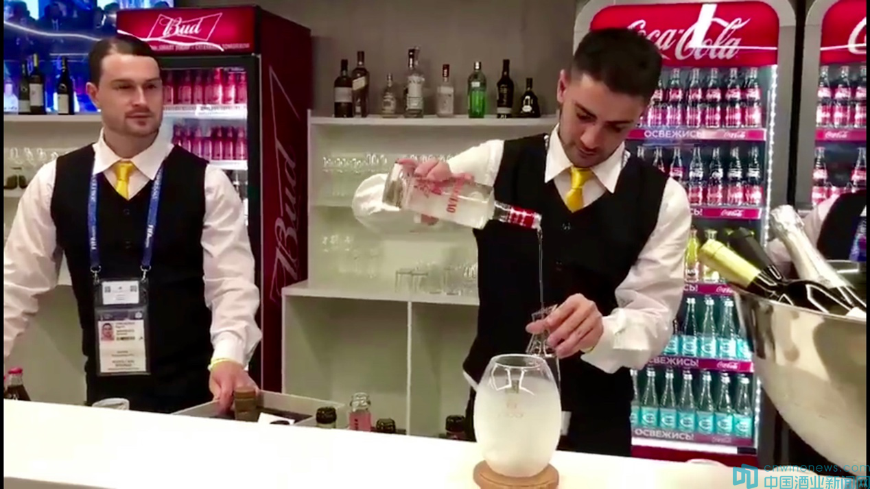 (俄罗斯世界杯款待包厢内,调酒师用国窖1573调制鸡尾酒Panda1573)