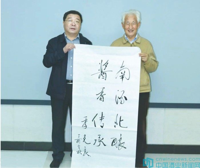 两个“来迟了”,三个“没想到”,令在场人员动容。老先生更是难抑激动,翰墨传情,运笔题赠:南酒北酿,酱香传承——季克良。没错,老者正是世界级酿酒大师、著名白酒专家、国家级非物质文化遗产传承人、茅台集团原董事长季克良。而他深切缅怀的“老师”杜安民,正是上世纪80年代刚一退休就受他指派来武城酒厂(古贝春集团前身)的酱香北宗古贝元之父,原茅台酒厂生产技术科长。