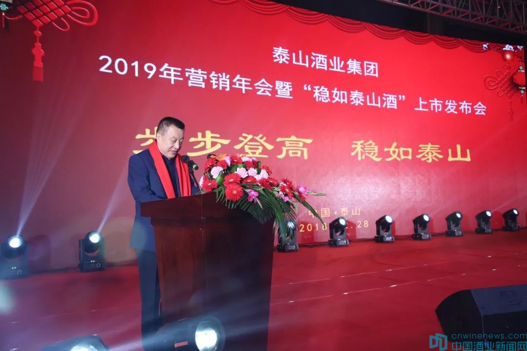 2018年12月28日,泰山酒业集团2019年营销年会暨“稳如泰山酒”上市发布会在泰安宝盛大酒店盛大召开。泰山酒业集团董事局主席、公司党委书记马西元,董事长兼总经理张铭新,常务副总经理、中国白酒工艺大师张彬,纪委书记、副总经理韩尚珂,党委副书记、副总经理刘艳林,工会主席、监事会主席王波,营销总监吴修刚等泰山酒业领导及来自全国各地的经销商代表、多家主流媒体共同相聚在泰山脚下,一起见证泰酒荣耀的经典时刻,共同憧憬泰酒发展的美好未来。