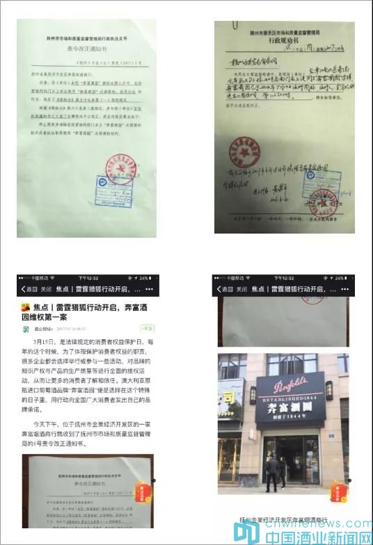 特别备注:上图为2017年奔富酒园雷霆猎狐侵权打击专项行动当地政府的市场监督管理局对一些已经涉嫌侵权的商家执行行政整改处罚文件和媒体报道的案例