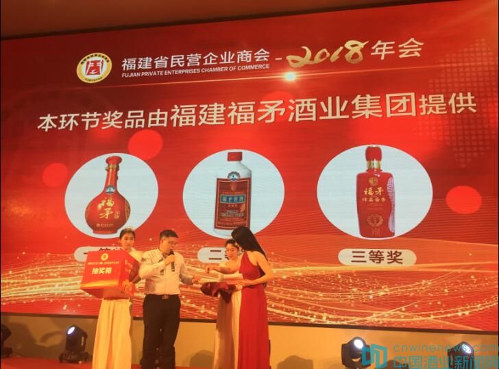 同日,福建民营企业商会2018年会在福州三迪希尔顿酒店举行,年会以“闽企汇榕、筑梦共荣”为主题,福矛酒业集团福州合福经理叶光和上台致辞,并为现场的民营企业家朋友们抽取由福矛酒业集团提供的福矛窖酒大奖。
