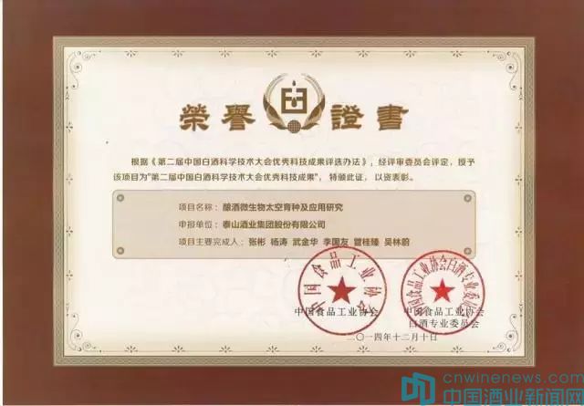 2013年,该项目通过省级技术鉴定,综合技术居于国际先进水平;2015年,在第二届中国白酒科技大会上,该项目荣获“中国白酒酿酒微生物研究十大科技成果奖”。在一项项荣誉的背后,更是泰山酒品质的显著提升。