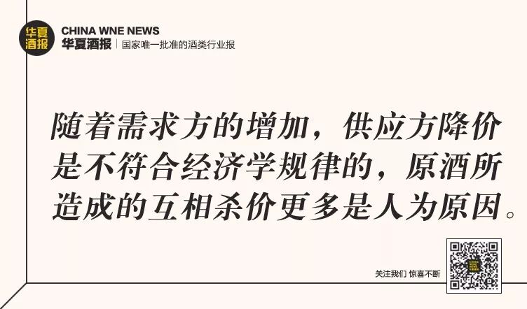 事实上,随着需求方的增加,供应方降价是不符合经济学规律的,那么“勾兑天下”的原酒所造成的互相杀价则更多是人为原因造成,正是为了保护整个产业的价格,通过一种结盟的形式来建立一些规则,彼此约束,就显得尤为重要。