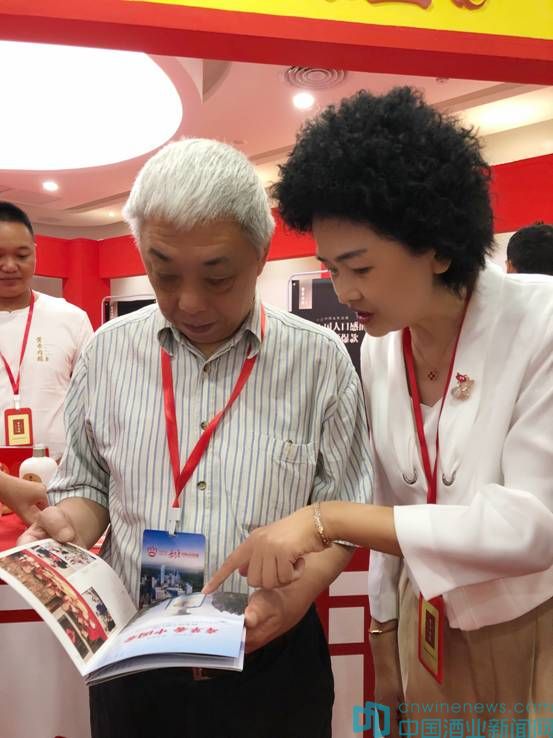 黄帝内经酒全球合伙人李冰给中国酒类流通协会专职副会长刘员介绍产品情况。