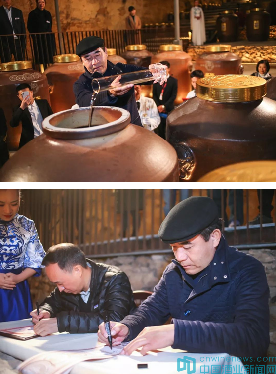 当日,陈宝国亲临郎酒庄园感受「生长养藏」,实地探访品质郎酒每一条脉络,分别体验了陈年老酒与兼香酒体的勾调。仁和洞里,汪俊林礼赠玉树台高端私人定制奢香私藏,以表感谢之情。宾主共签封坛信物,由陈宝国亲自为酒封坛。