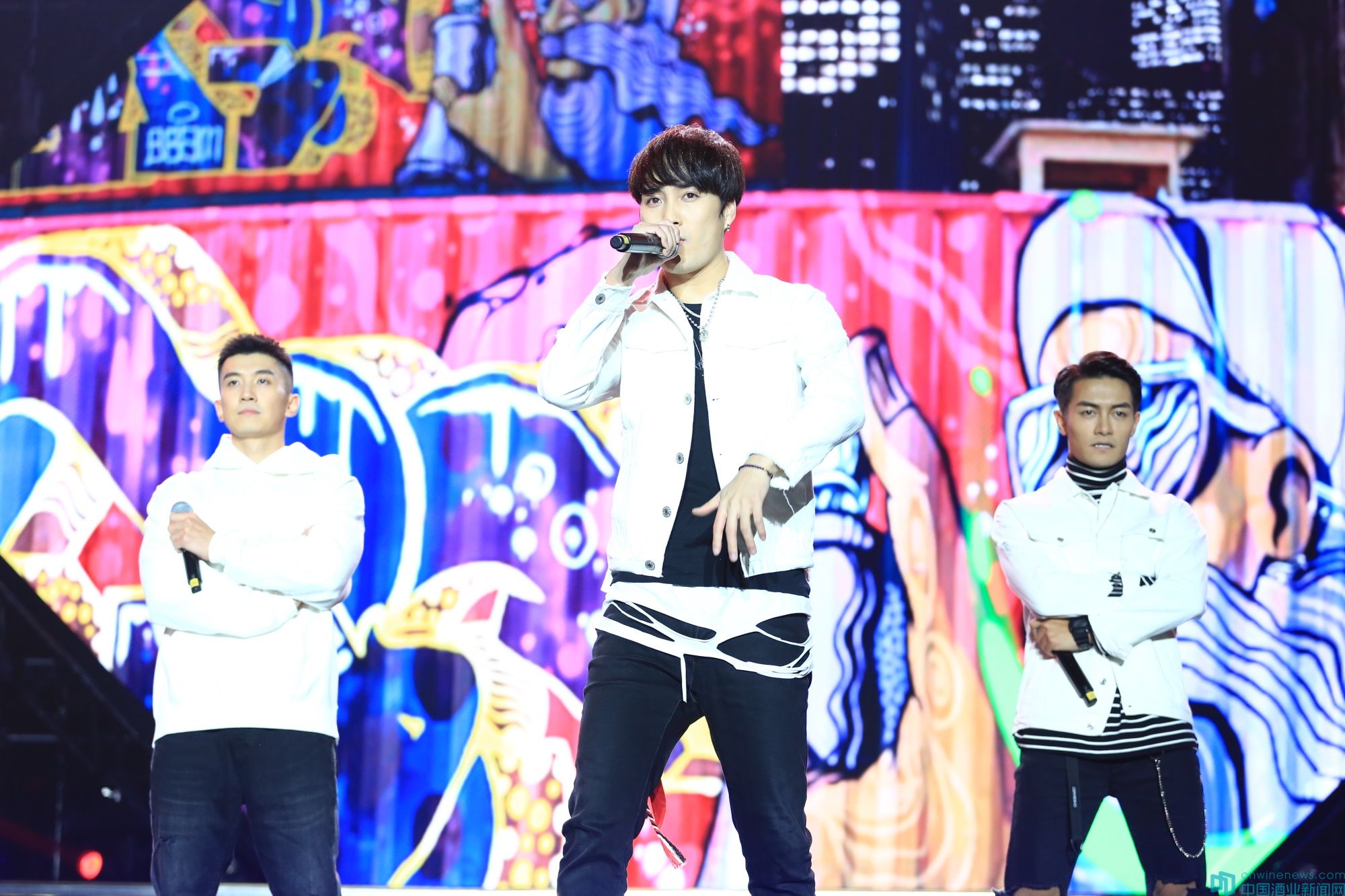 在开场劲爆迷幻的DJ电音中,首先登台的是偶像人气男团0086组合,只见三个阳光帅气的大男孩边唱边跳,舞动着青春旋律,带嗨全场气氛。