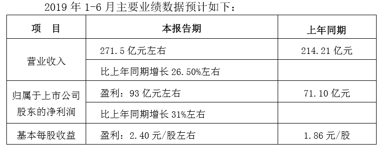 8月5日晚间,五粮液(000858)发布2019年半年度主要业绩数据公告,预计上半年营业收入达到271.5亿元左右,同比增长26.5%左右;归属于上市公司股东的净利润93亿元左右,同比增长增长31%左右;每股收益2.4元左右。