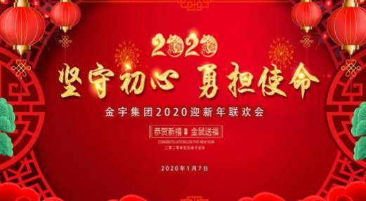 在金色大厅正面大屏上显示出八个大字为会议主题词:坚守初心勇担使命;两边的竖屏上打出了金宇集团的新年标语:继往开来不忘初心再出发,砥砺前行同心共筑金宇梦。