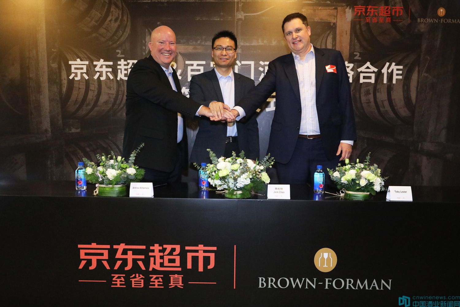(从左往右)百富门大中华区总经理Andrew McNamara, 京东零售集团消费品事业部酒类采销部总经理陈松锋,百富门全球电商副总裁Toby Lester