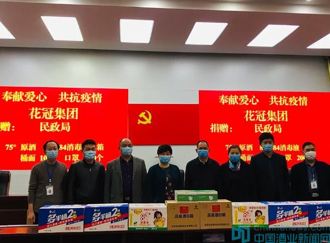 3月2日,花冠集团营销系统启动了复工工作。作为鲁酒龙头企业,花冠集团把助力社会战“疫”,当作复工后的重要任务来抓,紧密筹划、快速行动,全力支援社会战“疫”的最后决胜战。3月3日,花冠集团国花庄销售公司、冠群芳销售公司、花之冠销售公司联合在济南市平阴县发起了“奉献爱心、共抗疫情”活动,向平阴县慈善总会捐赠了价值6万余元的75度原酒、消毒液和口罩等防疫物资,分别分发到平阴县锦水街道办、榆山街道办、孔村镇政府、玫瑰镇政府、民政局、卫计委、教体局、义工协会等八家单位。平阴县民政局对本次捐助行动表达了感谢,并对花冠集团的社会担当表示称赞。冠群芳销售公司总经理郑海峰在发言中表示,花冠集团本着服务社会的理念,尽力为奋斗在抗疫前线的各界人士贡献一份力量。同时,这也是在回报平阴县人民对花冠一如既往地关心与支持。相信,在社会各级的共同努力下,全国战“疫”工作一定会快速取得最后胜利。