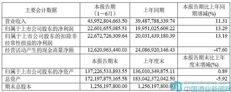 刚刚,贵州茅台发布2020年半年报,报告期内,完成基酒产量 4.81 万吨,其中茅台酒基酒产量 3.67 万吨、系列酒基酒产量 1.14 万吨;实现营业收入 439.53 亿元,同比增长 11.31%;实现归属于上市公司股东的净利润 226.02 亿元,同比增长13.29%。