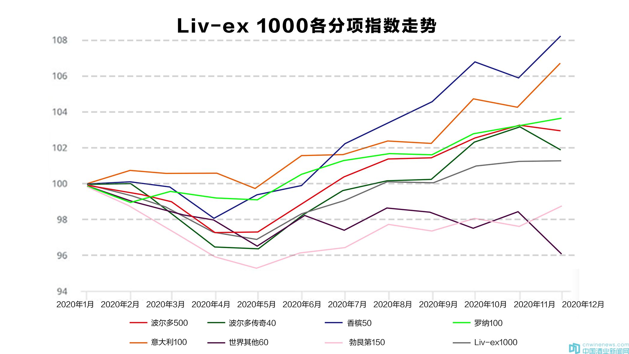 2020年,所有Liv-ex指数均告上涨,作为行业基准的佳酿100指数(Liv-ex 100)上涨了4.65%。11月,该指数达到两年来的最高水平,而交易额则达到了十年来的最高点。