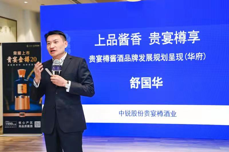 舒国华通过生动的现场演绎展示了“贵宴樽”品牌盛世风韵、大国礼器的设计理念,以酒为媒,寓意“以尊贵的酒器,盛满甘美的醇酒,敬献给尊贵的客人”的愿景,更通过充满匠心精神的贵宴樽系列产品展示,表达了贵宴樽酒业源于坚守酱香品质,坚守传统工艺的理念,为客户提供愉悦欢畅的高品质品牌酒品,以飨重要接待场景的高品位追求。