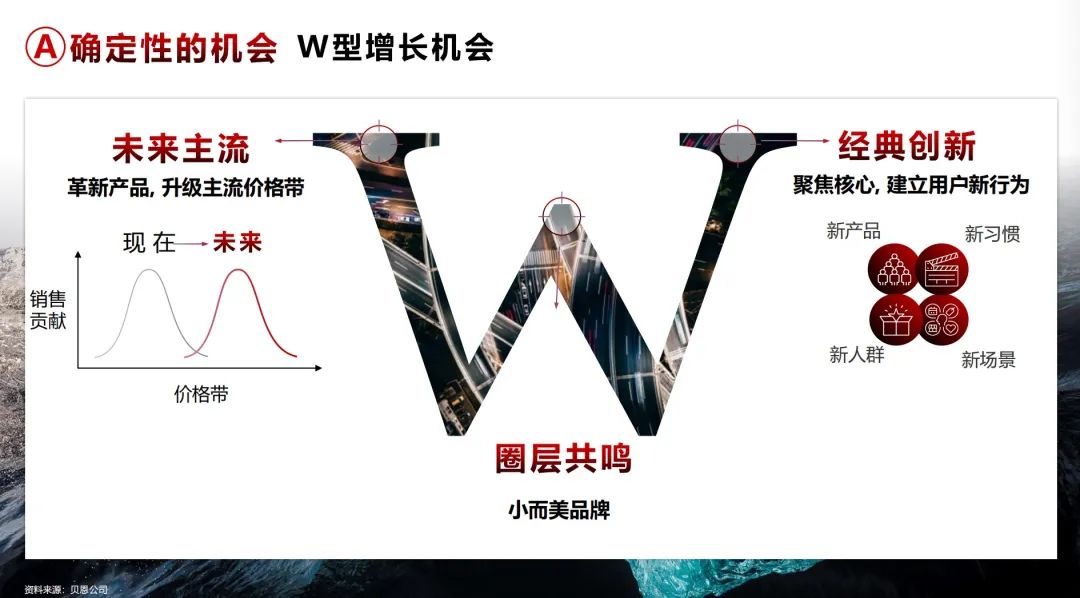 “W”型增长机会,首先是经典创新,聚焦核心业务,根据消费者改变的需求,创造新产品、扩展新人群、建立新习惯和打造新场景;第二个机会是未来主流,新的主流价格带就是未来的市场机会点,隐富人群的消费升级+都市夹心的消费降级共同作用推动了新的增长机会;W底部是圈层共鸣小而美品牌,谁能和目标消费群产生共鸣,谁就有机会抓住增长的机会。