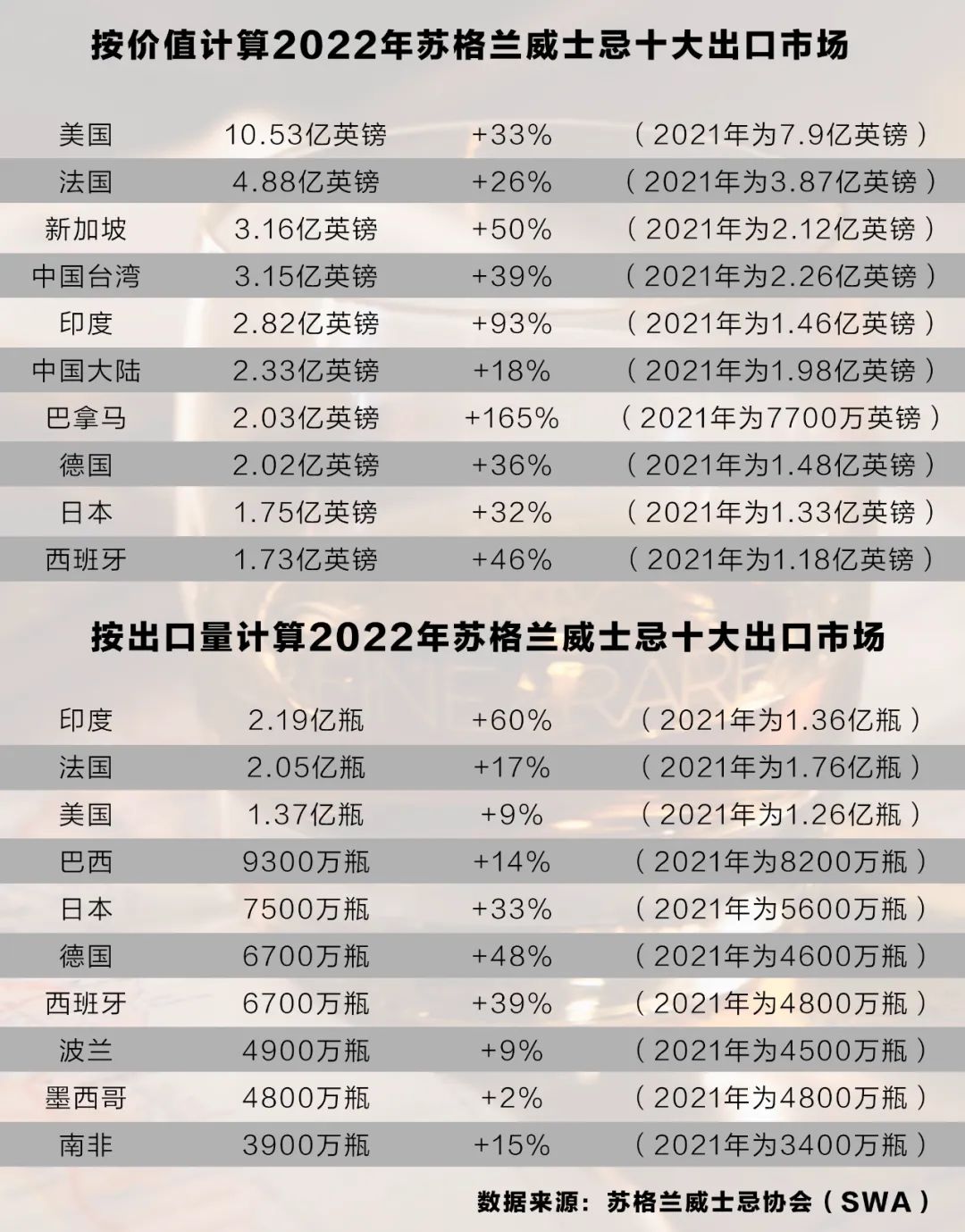 根据苏格兰威士忌协会(SWA)发布的最新数据,2022年苏格兰威士忌的全球出口首次突破60亿英镑。