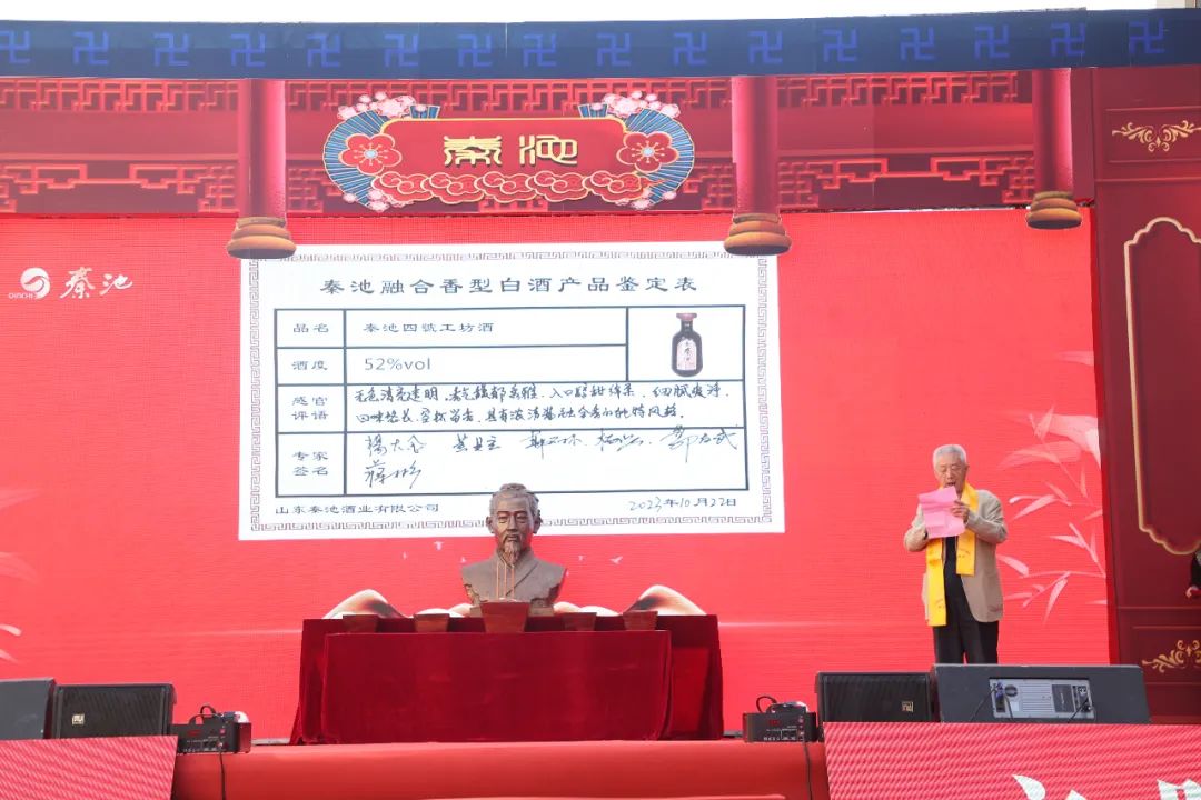 山东省白酒协会副会长兼秘书长蒋彬点评开坛老酒“微黄、晶莹透明,陈香舒适、优雅,酱香突出,酒体醇厚丰满,细腻,诸味协调,空杯留香持久,具有非常明显的酯香、花香”。原山东广播电视台新闻中心主持人、原上海电影艺术学院教师、潍坊朗诵与语言艺术协会秘书长韩晓飞庄严诵读了《秦池酒赋》,文字与酒香交相辉映,尽显独特魅力。