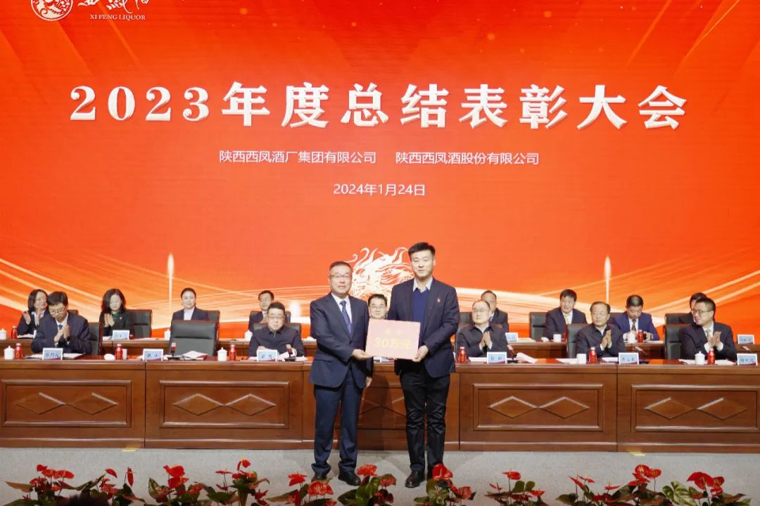 西凤股份公司总经理张周虎宣读《关于对2023年度先进单位、先进个人进行表彰奖励的决定》;西凤集团公司党委副书记、工会主席郭拴新宣读《关于对冲刺年度目标任务竞赛活动获奖集体及个人进行表彰奖励的决定》;西凤集团公司纪委书记、监察专员高原宣读《关于对营销系统完成2023年度销售目标任务进行表彰奖励的决定》;西凤集团公司副总裁杨会军宣读《关于对冲刺年度目标任务竞赛活动成品生产系统获奖集体进行表彰奖励的决定》;西凤股份公司副总经理师红勤宣读《关于表彰公司2023年度文明单位、文明班组、文明家庭、文明宿舍的决定》;西凤股份公司副总经理周艳花宣读《关于表彰2023年度先进分会、先进工会工作者及优秀工会积极分子的决定》。宝鸡市副市长张昭,宝鸡市副秘书长苗崑,宝鸡市国资委党委书记、主任朱吉良以及公司领导为受表彰的先进单位和个人颁发了奖牌、证书以及荣誉奖励;公司标兵邓伟佳、惠晓青、张博、张盼分别作了表态发言。