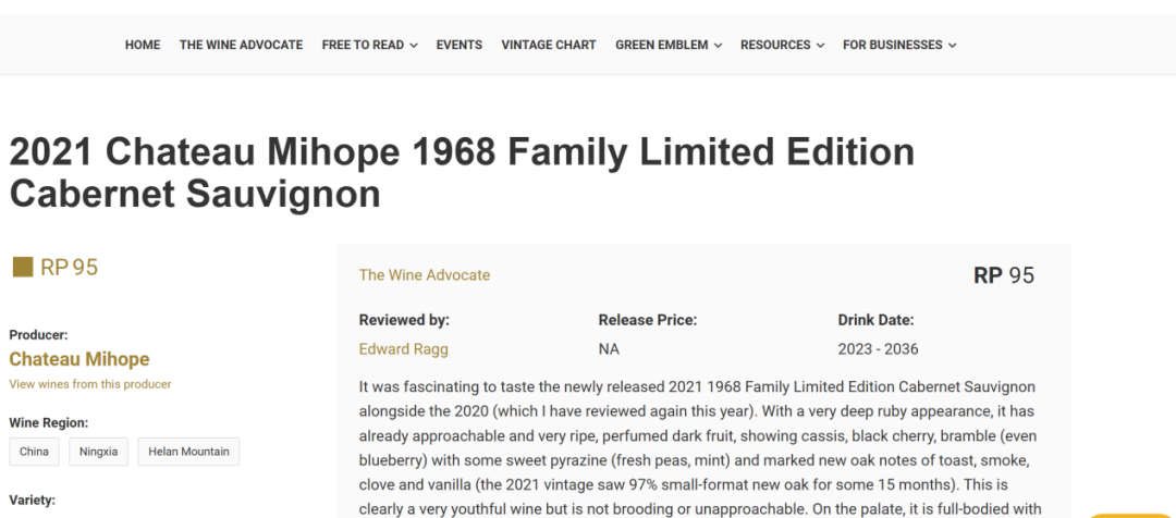 就在美贺庄园获得2024胡润中国葡萄酒酒庄TOP10殊荣的同时,美贺庄园的旗舰酒款——家族典藏1968干红葡萄酒2021年获得了罗伯特·帕克团队给出的95分高分。