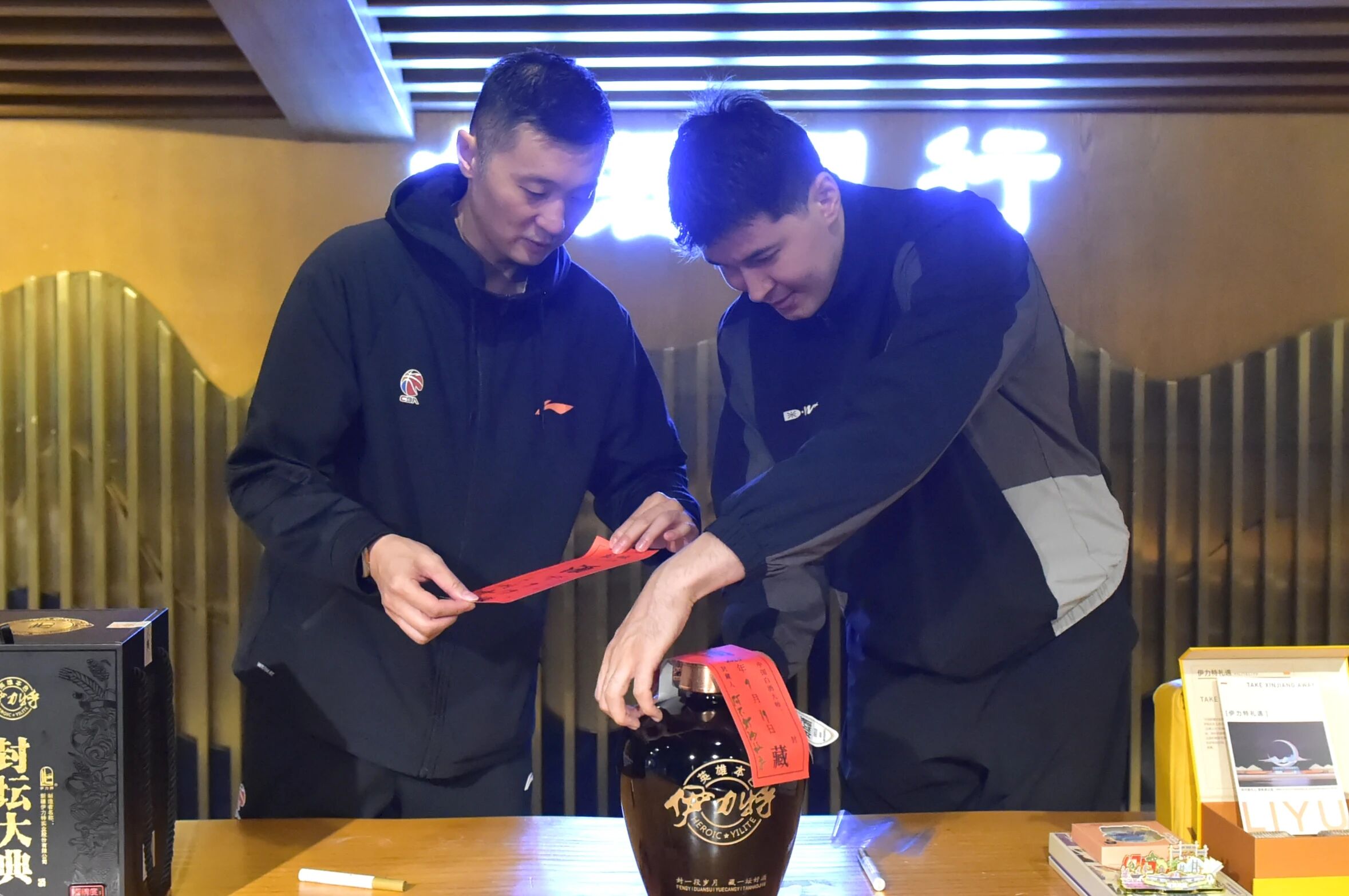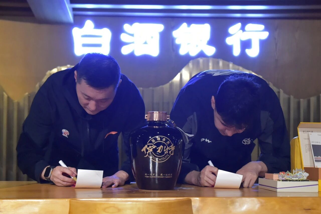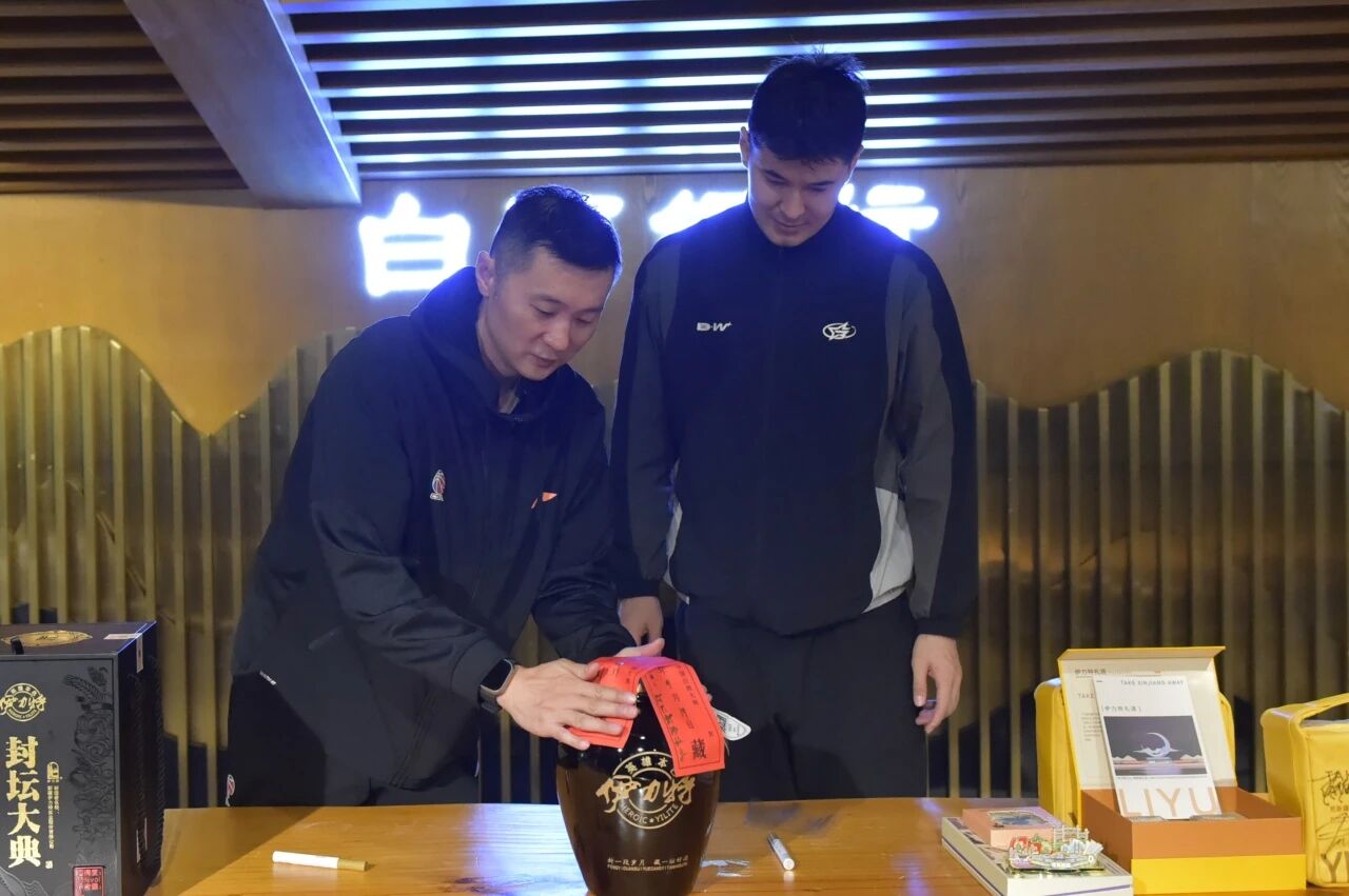 随后的“酒体勾调”体验更添趣味。讲解员系统讲解了白酒勾调知识后,队员们在酒体设计师的辅助下,调制专属“MVP特饮”,一次次调和、品鉴,如同赛场上的战术磨合,耐心与精准缺一不可。主教练刘炜与队长阿不都沙拉木则代表球队,将一坛5L封坛酒签名封存于白酒银行,这坛酒不仅是此次驻训的独特见证,更是象征着体育精神与匠心文化的“时光沉淀”。