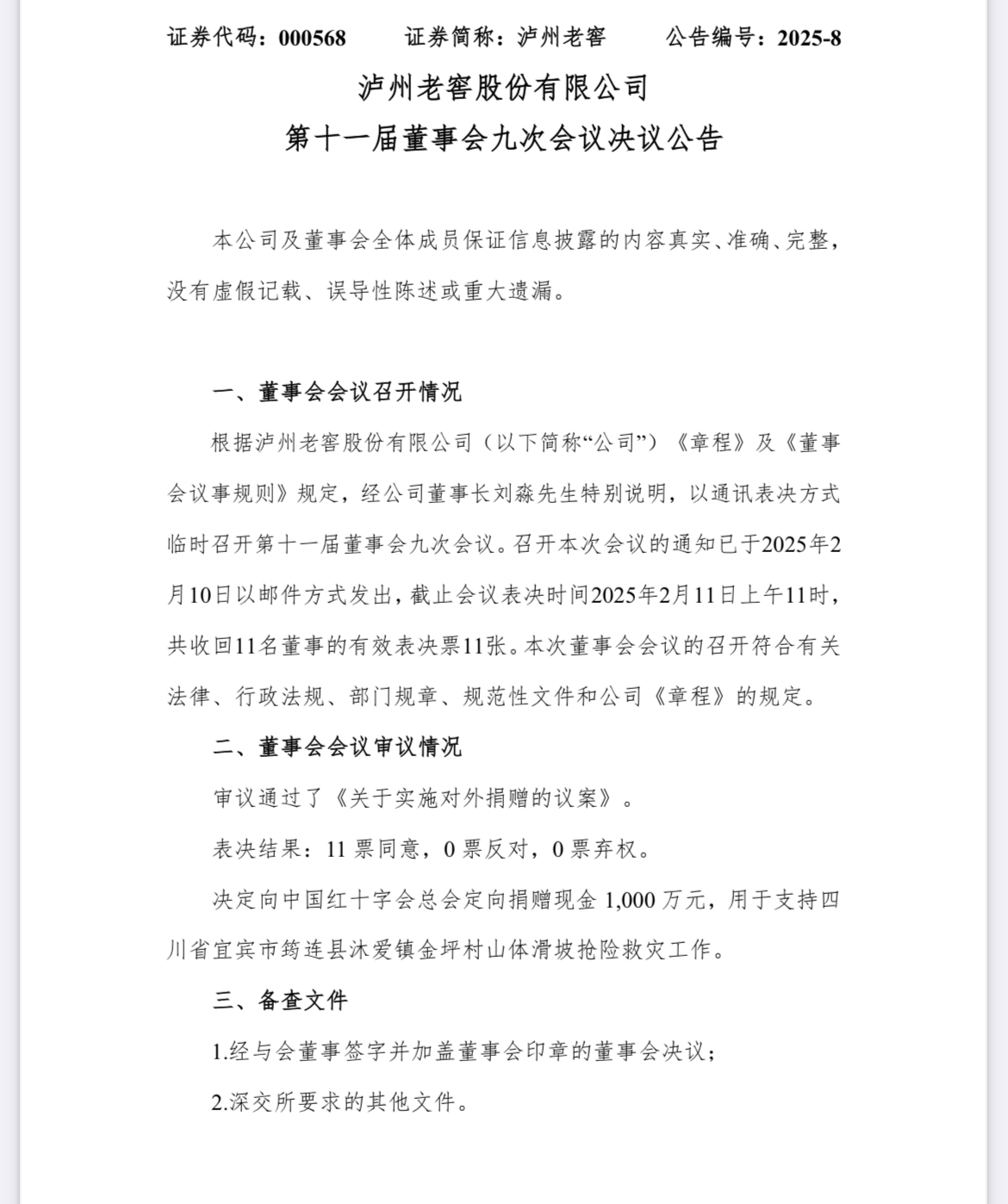 2月11日,泸州老窖发布公告称,公司决定向中国红十字会总会定向捐赠现金1000万元,用于支持四川省宜宾市筠连县沐爱镇金坪村山体滑坡抢险救灾工作。