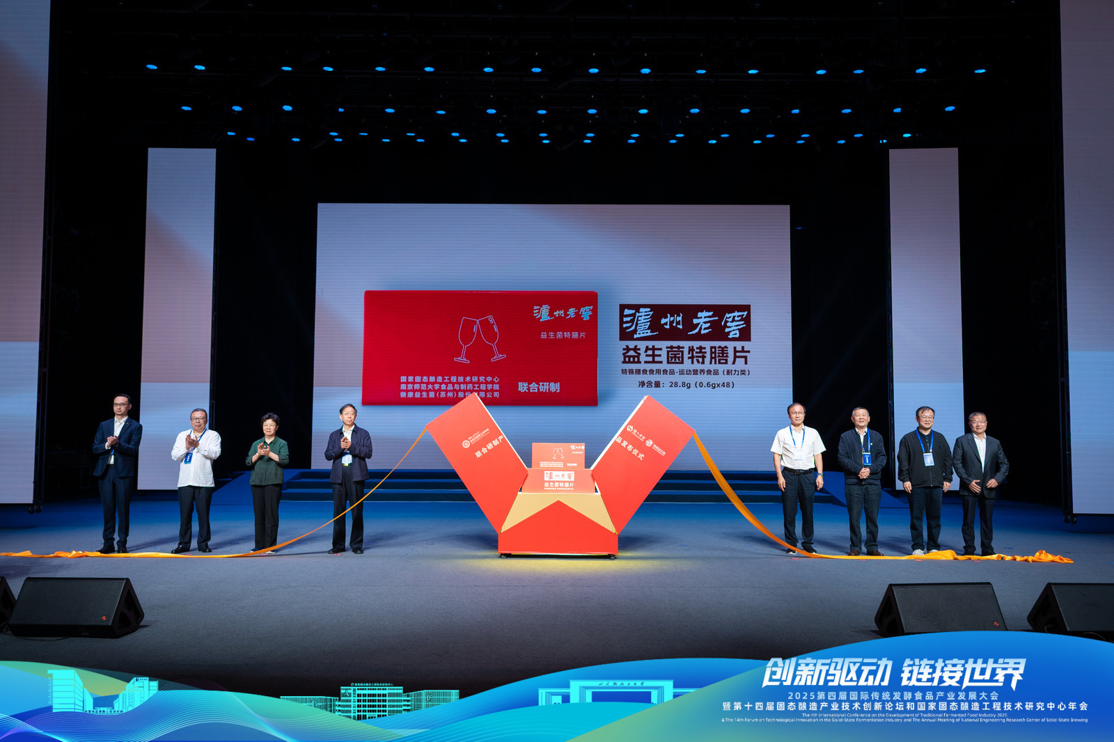 在邓子新、孙宝国、石碧、朱蓓薇四位院士的见证下,黄和院士、沈才洪副总经理、张宿义副总经理及朱建国副总经理共同发布了科研新品——泸州老窖益生菌特膳片。特膳片由南京师范大学、泸州老窖及微康益生菌联合研制。这一创新力作,是泸州老窖在探索健康与品质生活上迈出的坚实一步,旨在进一步提升饮酒体验、倡导健康生活,为赋能固态酿造产业大健康产品开发开辟了新方向,也为传统酿造行业探索品质升级与健康赋能提供了新范例。