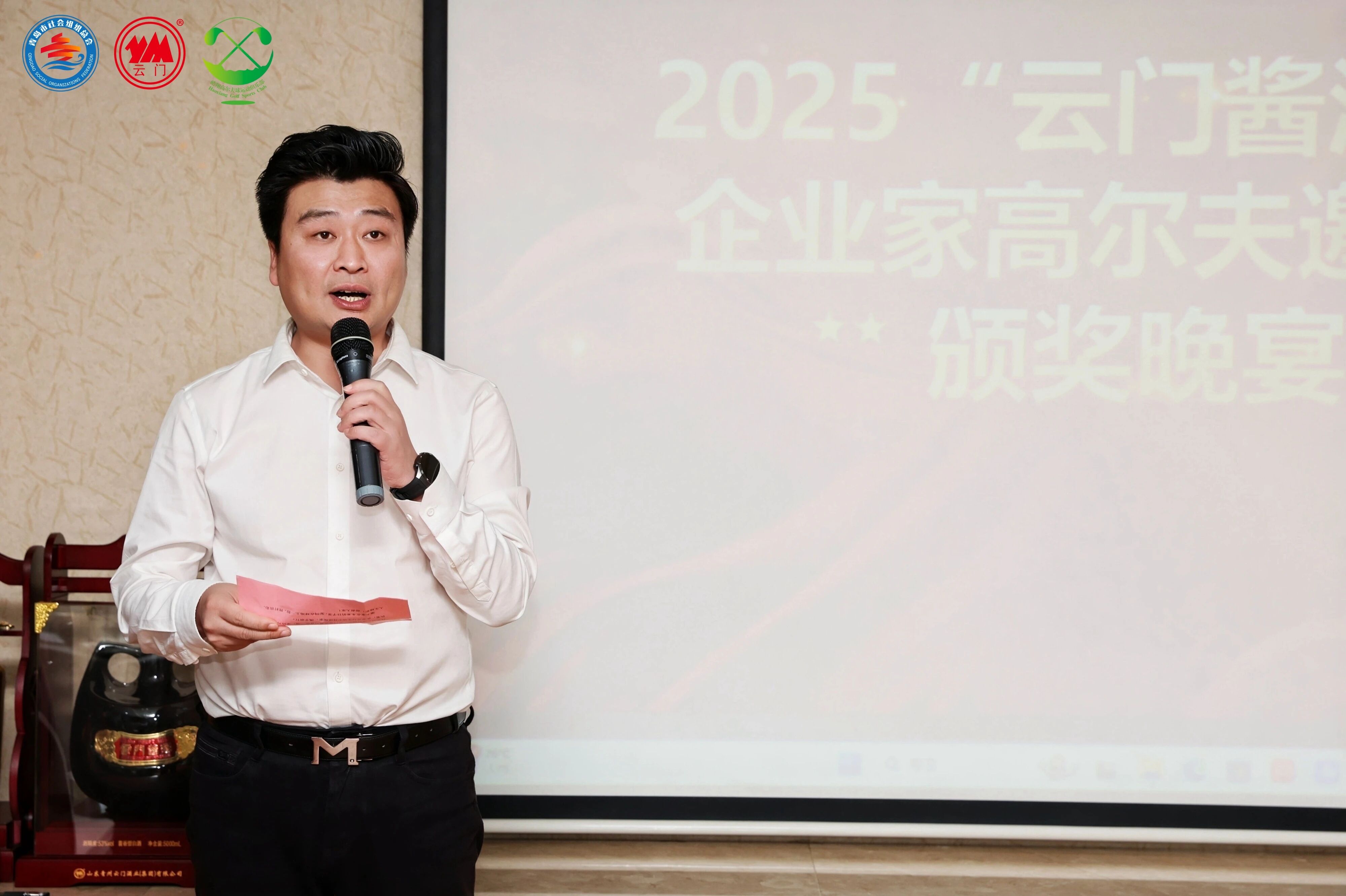 在比赛结束之后的颁奖晚宴上,张万斌表示,“云门作为北方酱酒的创领者、山东高端酱香的引领者,始终以匠心酿造每一滴酒,以品质传递我们对生活的热爱与坚守。正如高尔夫运动所展现的优雅与挑战并存,我们的酿酒之路,同样是一场关于精准、耐心与专注的修行。”致辞过后,现场颁发了此次比赛的总杆前三名及最远距离奖和最近旗洞奖的奖品。