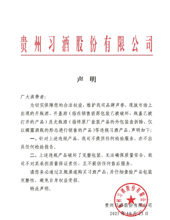 10月23日,贵州习酒在其网站发布一则致消费者的声明,针对开瓶酒、开盖酒、光瓶酒等违规产品,不出具检验报告、不提供售后服务。具体内容如下: