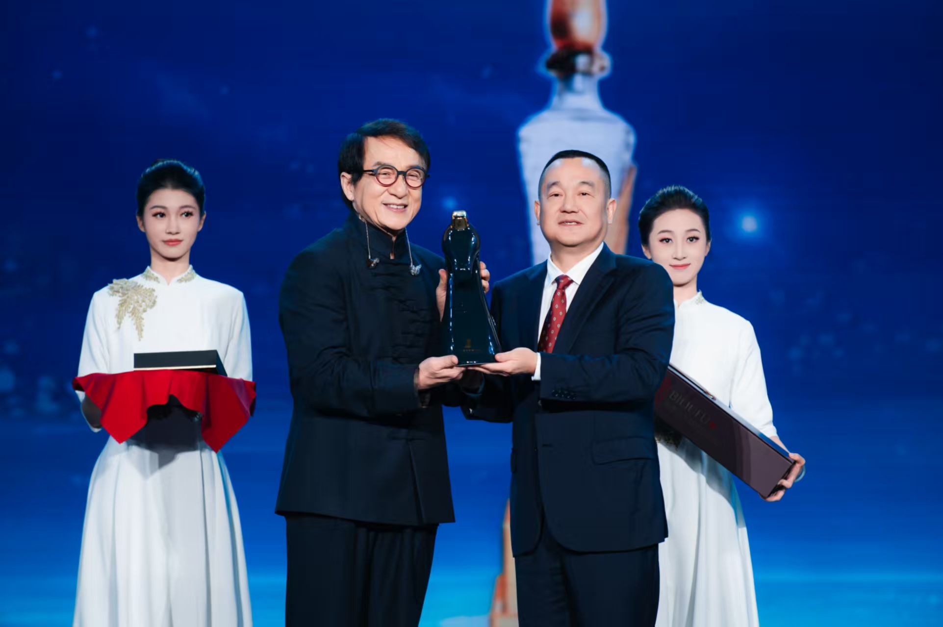 再次点燃现场的是,成龙以泸州老窖·国窖1573文化传播大使的身份惊喜登台。作为致力于向世界传播中国文化的国际巨星,成龙和酒城泸州缘分殊胜,此次他为泸州送上了一份特别的礼物:一套从未公开发行、名为“我还是成龙”的限量版碟片。“我把这份承载光影岁月的礼物送给泸州,愿它也成为诗酒文化中一段温暖的记忆。”泸州老窖集团(股份)公司党委书记、董事长刘淼,国家级非遗“泸州油纸伞制作技艺”代表性传承人毕六福则代表泸州向成龙赠送了两份特别的礼物:一份是“活态双国宝”酿造的国窖1573定制酒“一马青云”,寓意龙马精神、马到成功;一份是国家级非遗代表“水墨龙油纸伞”,寓意圆满吉祥。
