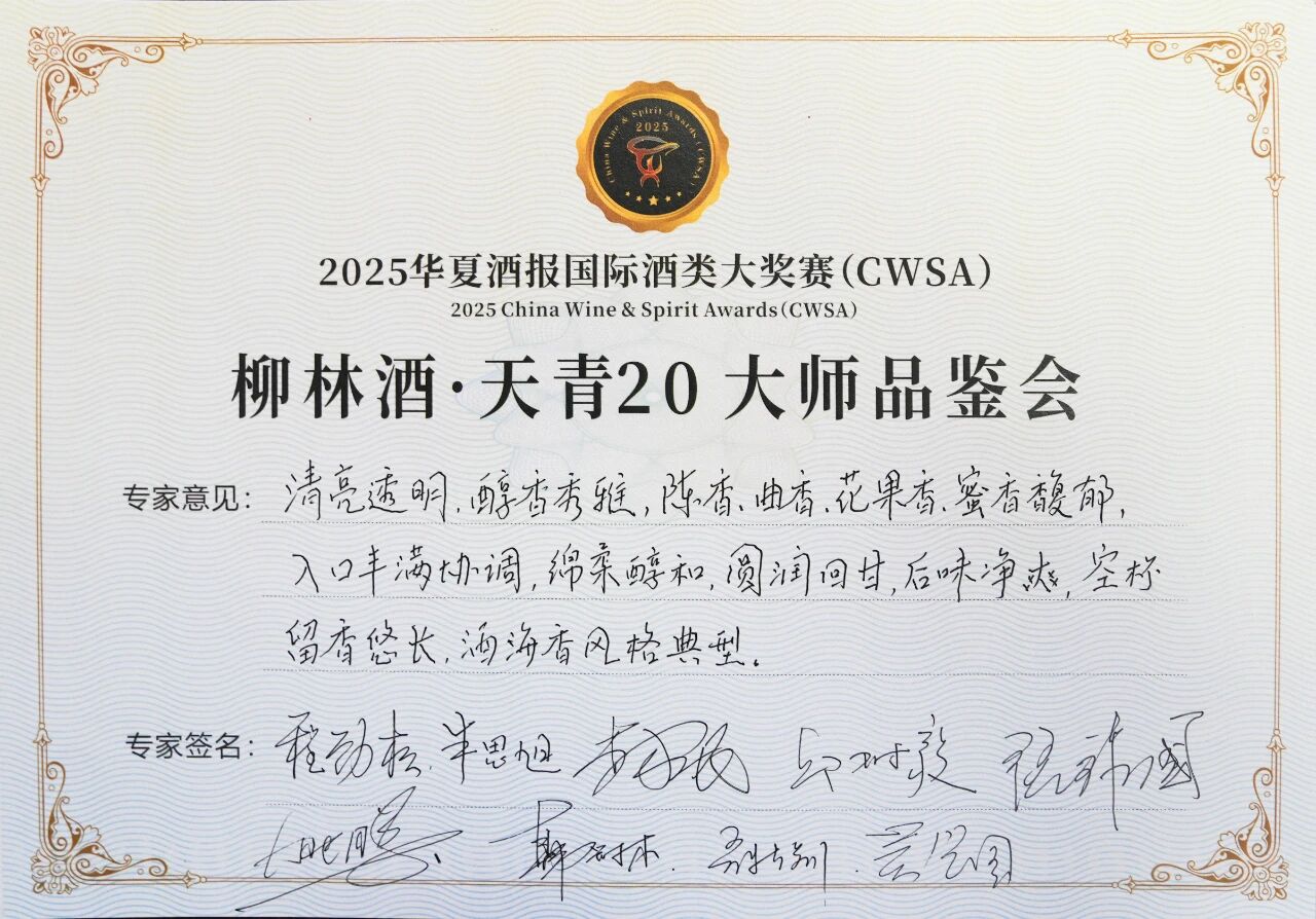 经过一轮轮的品鉴与深入讨论,与会专家们共同签署品鉴意见书,一致认为,“柳林酒·天青20”:“清亮透明,醇香秀雅,陈香、曲香、花果香、蜜香馥郁,入口丰满协调,绵甜醇和,圆润回甘,后味净爽,空杯留香悠长,酒海香风格典型。”