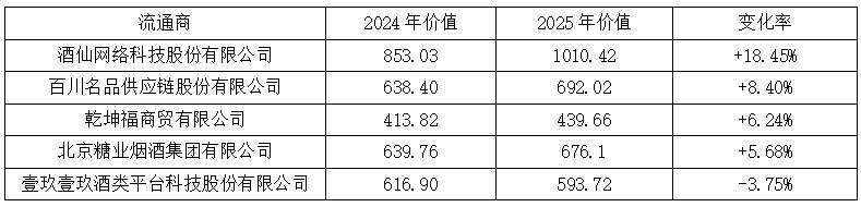 酒类流通商在本轮酒行业调整期中表现出强劲韧性,2024-2025年集中度持续提升,头部企业通过渠道整合与数字化红利(流通商年均数字化投入增长40%+)、技术赋能(AI选品和动态库存系统提高周转效率30%),进行深化变革,实现了规模扩张。前十大流通商品牌价值总和从5,177.44亿元增至5,254.41亿元,增长1.49%。