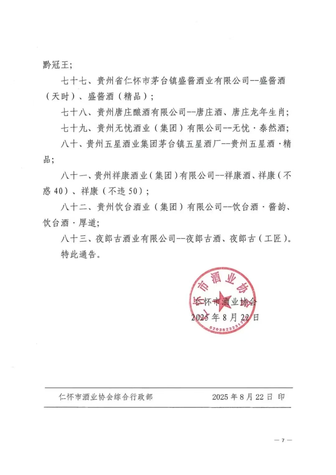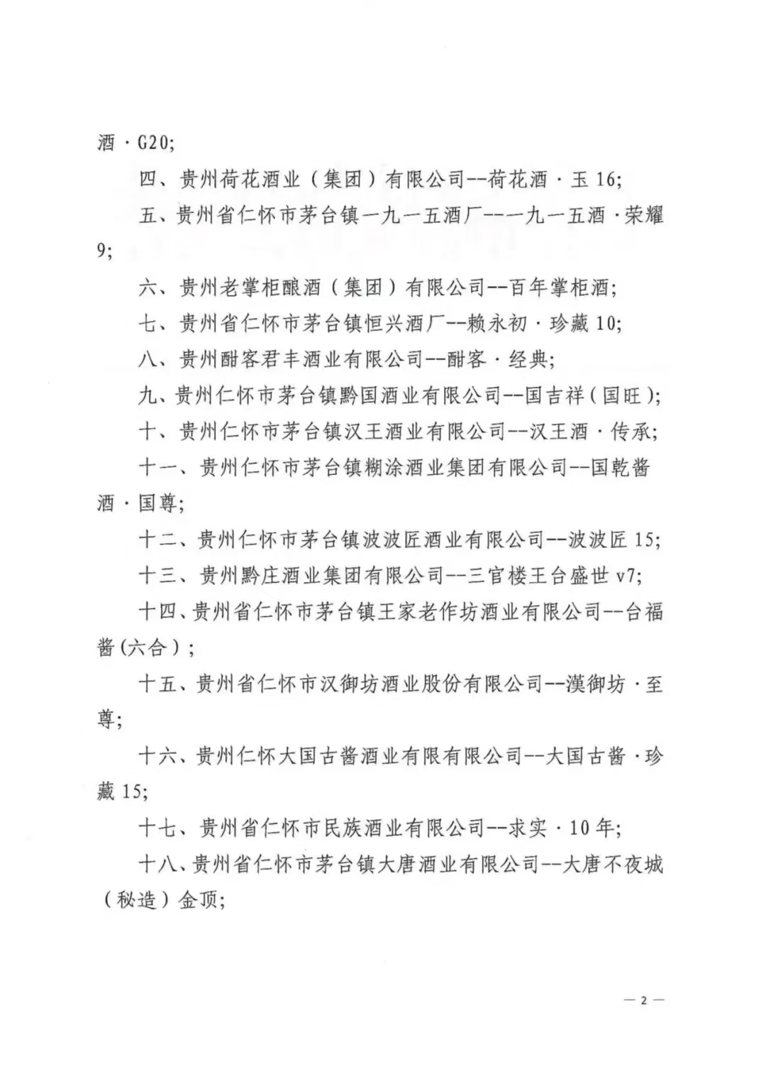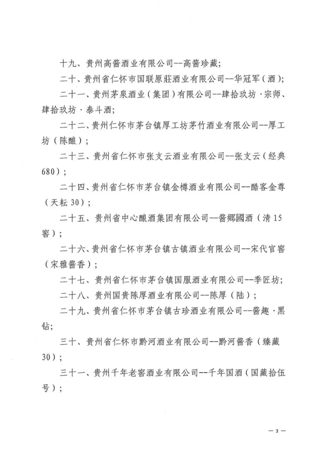12月25日,据仁怀酒协微信公众号消息,根据仁怀市工业能源和科学技术局、仁怀市中小企业服务中心关于《中国酱香白酒核心产区(仁怀)名称及标识图使用管理办法(试行)》的有关规定,现公布第一批“中国酱香白酒核心产区(仁怀)”标示图授权使用企业及产品名单,共有贵州钓鱼台国宾酒业有限公司--钓鱼台国宾酒、贵州怀庄酒业(集团)有限责任公司--怀庄酒、怀庄酒(创始之魂)等83家企业在列(排序不分先后,该通告已于8月份书面印发,此次应读者要求在官微公开发布)。具体名单如下: